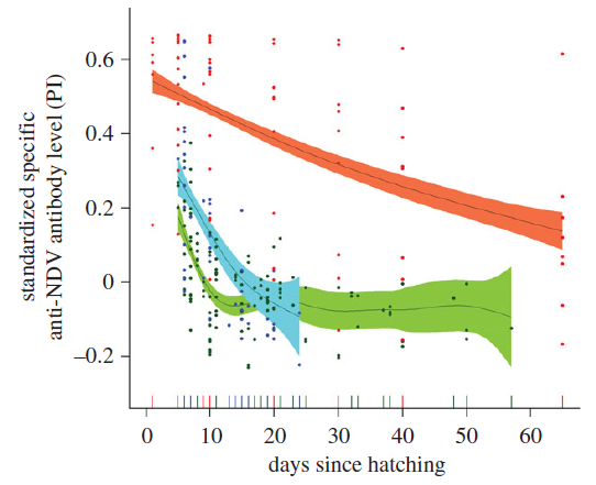 Our earlier finding that maternal antibodies in Cory’s shearwater can persist a long time in nestlings lead us to suggest that vaccination could be used an efficient conservation tool in species exposed to infectious disease killing nestlings and against which a vaccine can be made available (Garnier et al. 2012 PRSB). The efficiency of such an approach would nevertheless rests on the ability for a vaccinated female to transmit persisting antibodies several years in a row; this is what we showed in a study involving vaccination against NDV and the tracking of decay of antibodies in nestlings over several years (Ramos et al. 2014 American Naturalist)