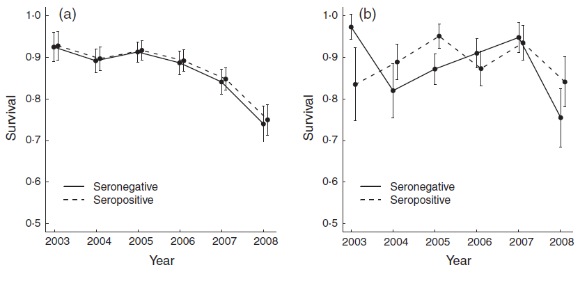 In a study using multi-event capture-mark-recapture modelling to account for potential differences in recapture and resighting probabilities among categories of individuals, we showed that annual survival of breeding kittiwakes does not differ between individuals that are seropositive and seronegative against Lyme disease Borrelia (Chambert et al. 2012 Journal of Animal Ecology).